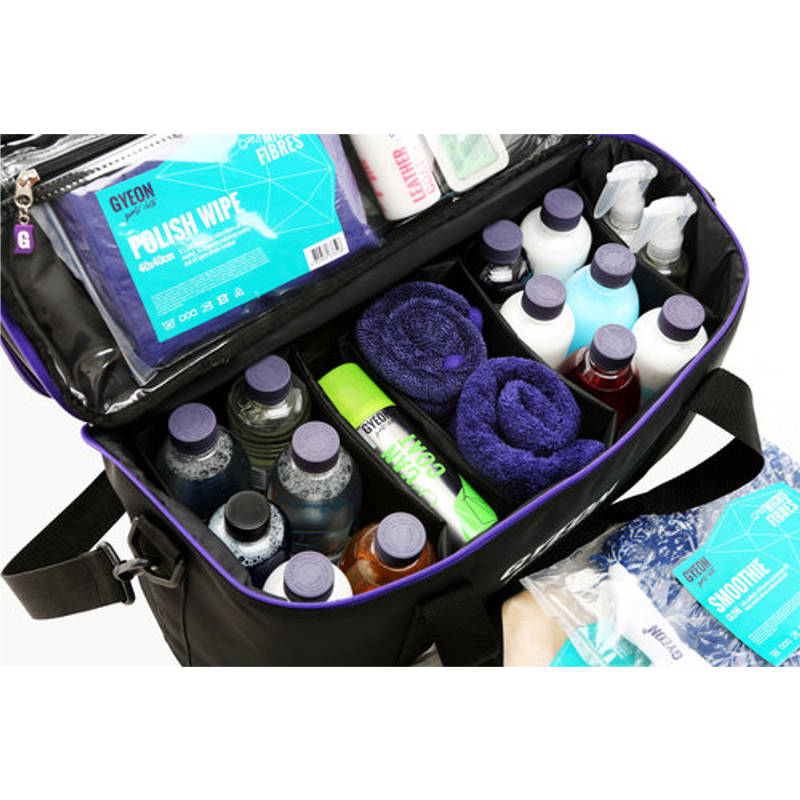 Die Gyeon Detailer Tasche ist optimal zum verstauen seiner Pflegeprodukte, um diese auf Treffen oder zur Waschbox mitzunehmen. Im großen Fach der Tasche, lassen sich die Trennwände mittels Klettverschluss variabel anbringen, auf der oberseite lassen sich perfekt Bürsten und Kleinigkeiten verstauen. Im oberen Fach lassen sich diverse Mikrofasertücher Bürsten und Klinequitment sicher vertauen. Insgesamt ist die Gyeon Detail Bag big eine sehr hochwertig verarbeitete Tasche.