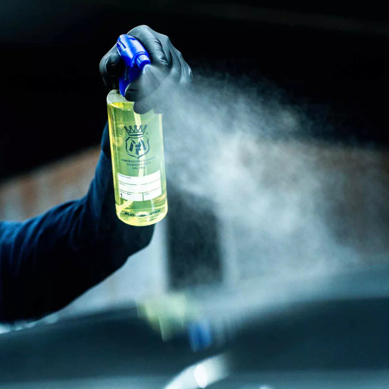 Preludio Acidic von Labocosmetica ist eine innovative, saure Vorbehandlungslösung, speziell entwickelt für die wasserlose Autowäsche. Diese leistungsstarke Lösung entfernt effektiv anorganische mineralische Verunreinigungen wie Kalkflecken, die herkömmliche neutrale Reiniger nicht beseitigen können. Besonders nach Regen oder Schneefall bildet sich ein Rückstand, der das Erscheinungsbild des Fahrzeugs beeinträchtigt und ohne eine saure Behandlung schwer zu entfernen ist.
